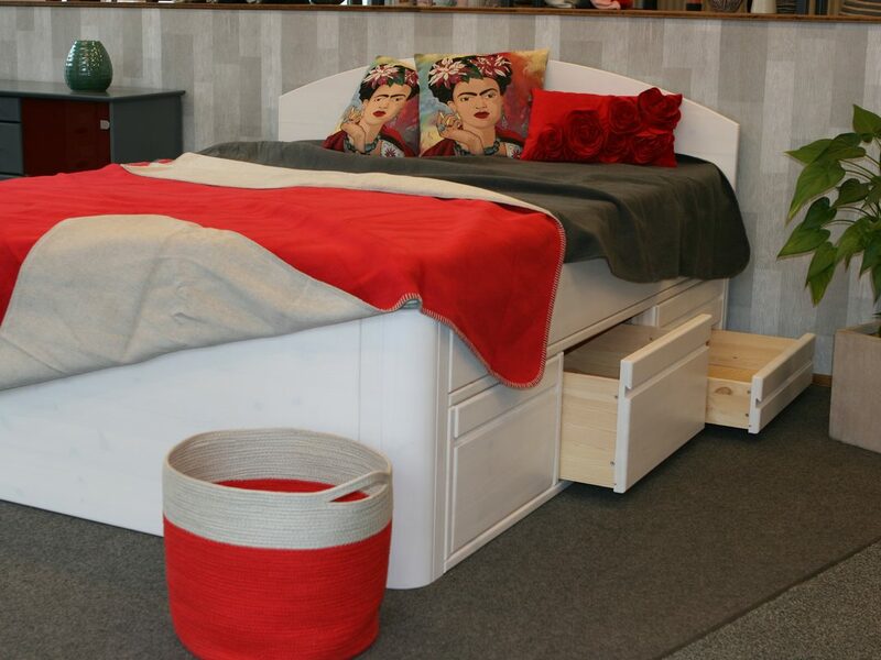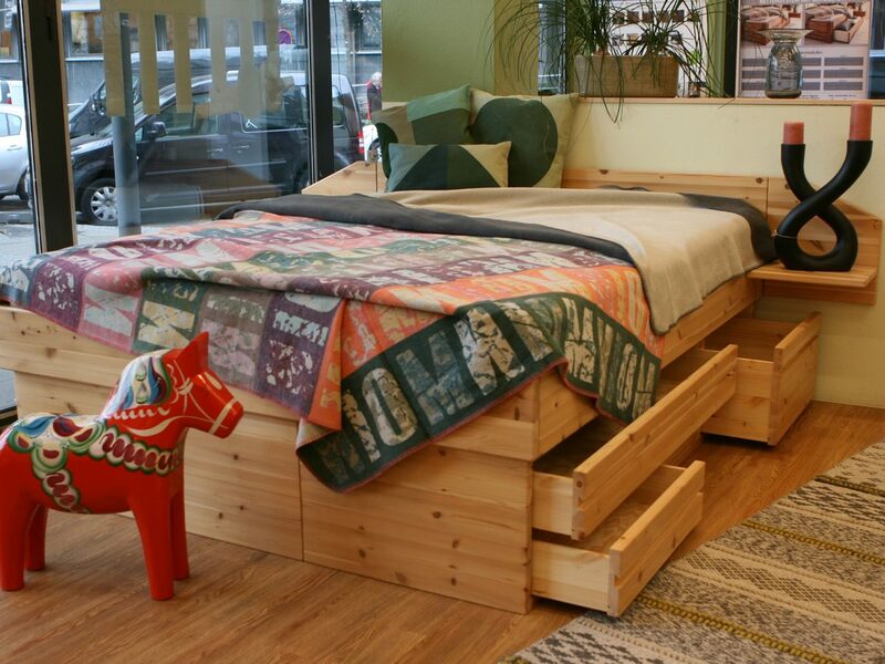 Unser Schubladenbetten "Gotland" (links) und "Øland" (rechts) aus massiver Kiefer in Schweden gebaut, für alle gängigen Matratzengrößen, mit Schubladenmodulen (verschiedene Schubladenaufteilungen möglich), auf einer oder auf beiden Seiten ....in Kiefer natur-lackiert, und in sechs weiteren Oberflächen: weiß, nussbaum, cognac, anthrazit, grau und rot.